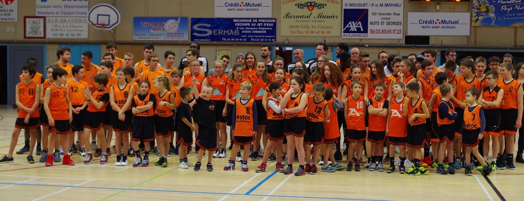 Du groupe baby aux seniors, deux cents basketteuses et basketteurs, constituant les quinze équipes de l'Amicale Laïque de Nuits St Georges (ALN), ont été présentés au public de la salle omnisports lors de la mi-temps du match Nuits-Fontaine, dimanche 15 janvier 2017.